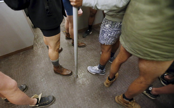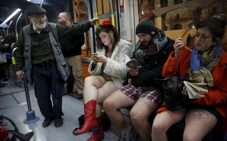 Την ημέρα χωρίς παντελόνι, που γιορτάστηκε χθες σε όλο τον κόσμο, οι συμμετέχοντες κατεβαίνουν ημίγυμνοι στο μετρό και σαν να μη συμβαίνει τίποτα πηγαίνουν στον προορισμό τους, ανάμεσα στους υπόλοιπους ντυμένους επιβάτες.