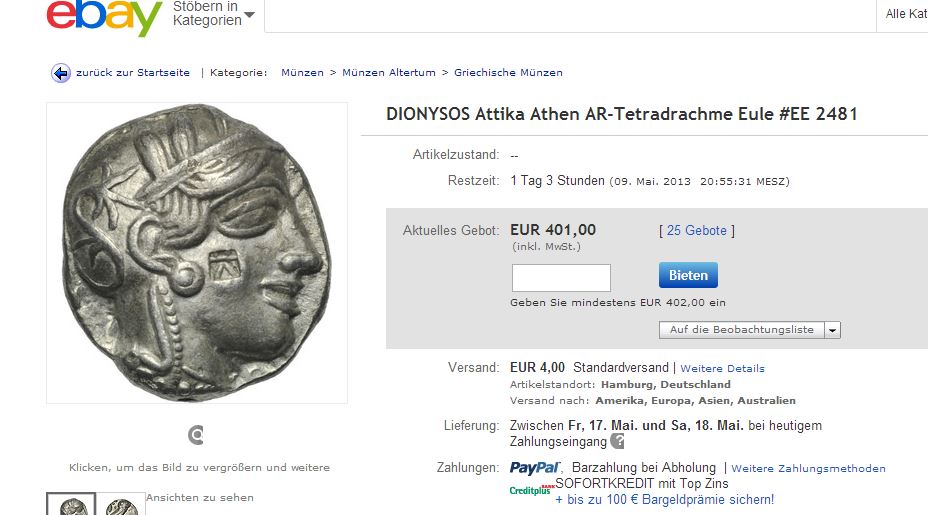 Αυτά είναι μόνο δύο από τα πολλά παραδείγματα με τα κλεμμένα ελληνικά αρχαία που πωλούνται στο διαδίκτυο όπως, ο ιδιώτης από το Αμβούργο που ζητάει μόλις 401 ευρώ για ένα τετράδραχμο νόμισμα της αθηναϊκής Δημοκρατίας που απεικονίζει τον Διόνυσο.