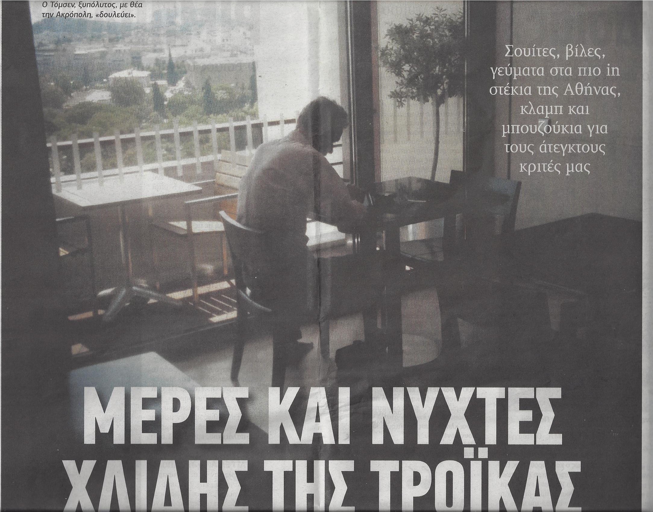 Μένει σε πολυτελείς σουίτες ξενοδοχείων ή σε βίλες στη Φιλοθέη, γευματίζει στα “καλά” εστιατόρια της Αθήνας και στον ελεύθερο χρόνο του γυμνάζεται σε γνωστό γυμναστήριο. Ο σκληρός Πολ Τόμσεν απολαμβάνει τη διαμονή του στην Αθήνα, όπως θα δείτε στο ρεπορτάζ της εφημερίδας “Παραπολιτικά”.