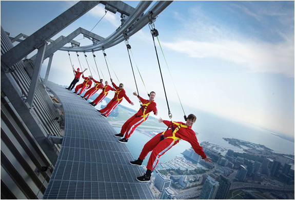 Πάνω σε αυτή την κυκλική εξέδρα, οι ατρόμητοι επισκέπτες φορώντας ειδικά ρούχα δένονται προσεκτικά και κρεμιούνται το χείλος της εξέδρας, ενώ μπορούν να κάνουν μια βόλτα γύρω-γύρω από τον πύργο.