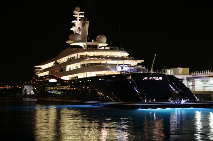 Η θαλαμηγός Al Mirqab είναι 133 μέτρα, έχει 54 άτομα πλήρωμα, 5 σουίτες, πισίνα, ελικοδρόμιο, γυμναστήριο, τζακούζι και όλα όσα οφείλει να έχει ένα γιοτ που σέβεται το μέγεθος και την χλιδή του.