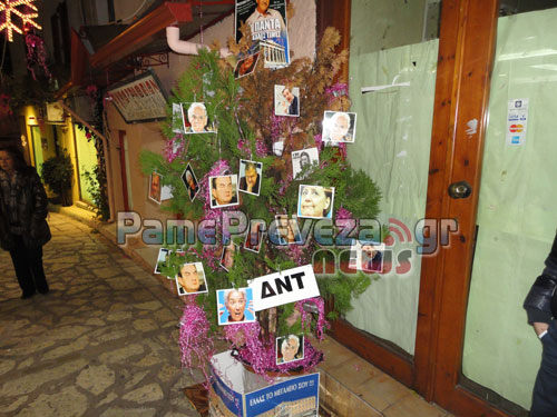 Με φωτογραφίες πρώην πρωθυπουργών, υπουργών οικονομικών, της Κριστίν Λαγκάρντ αλλά και της Ανγκέλα Μέρκελ στόλισαν το Χριστουγεννιάτικο δέντρο στο Σαϊταν Παζάρ στην Πρέβεζα.