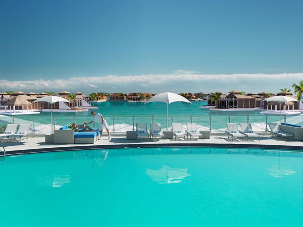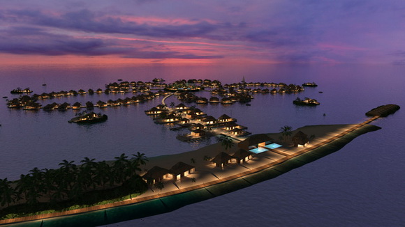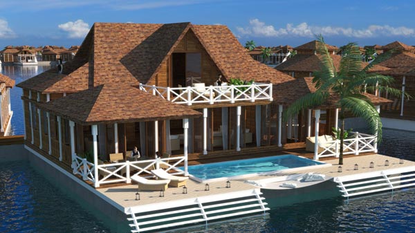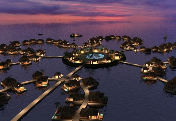 Στο κέντρο του «λουλουδιού» δεσπόζει μία μεγάλη πισίνα, ενώ διάδρομοι πάνω στο νερό συνδέουν τα σπιτάκια μεταξύ τους, αλλά και με το κέντρο του ξενοδοχείου.