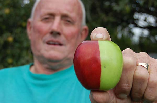 «Καλλιεργώ μήλα εδώ και 45 χρόνια και πρώτη φορά είδα κάτι τέτοιο. Δεν είναι μόνο η διαφορά στο χρώμα αλλά και η τέλεια διαχωριστική γραμμή που υπάρχει μεταξύ πράσινου και κόκκινου χρώματος», αναφέρει ο Ken.