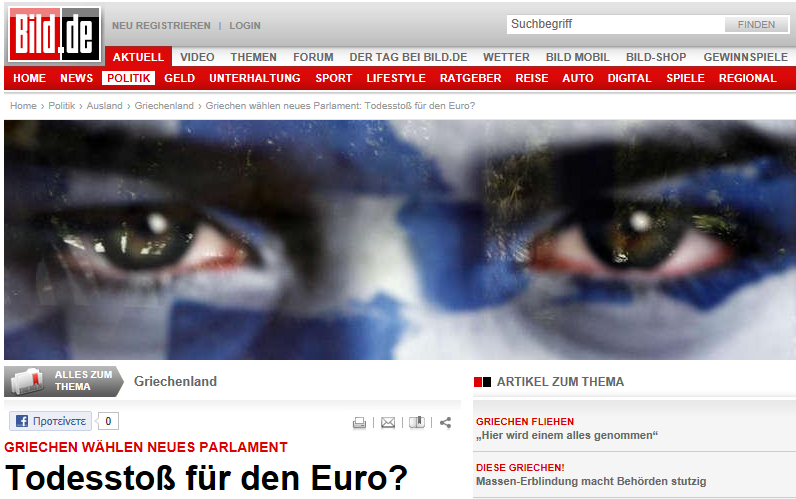 “Κρούση θανάτου για το ευρώ;” είναι ο τίτλος δημοσιεύματος της γερμανικής εφημερίδας Bild, που αναφέρεται στις σημερίνες εκλογές και στις ενδεχόμενες συνέπειές τους για την Ευρωζώνη. “Σήμερα παίζονται όλα” γράφει η Bild και συνεχίζει:”Η Ελλάδα εκλέγει νέο Κοινοβούλιο και η Ευρώπη τρέμει… για το αποτέλεσμα! Σήμερα οι Έλληνες καθορίζουν την τύχη των Ευρωπαίων, εκτός από τη δική τους. “Στις 7 μ.μ. αναμένονται οι πρώτες εκτιμήσεις. Ωστόσο μέχρι τότε, ένα είναι σαφές:ο αγώνας είναι εξαιρετικά σκληρός!”. “Αυτό που θα κρίνει τελικά την επόμενη ημέρα, είναι τα ποσοστά των δύο μεγάλων κομμάτων -ΠΑΣΟΚ και Ν.Δ.- τα οποία είναι και τα μόνα που υπεραμύνονται του προγράμματος λιτότητας για το οποίο έχει δεσμευτεί η χώρα.” “Το αν τελικά κερδίσουν την πλειοψηφία θα εξαρτηθεί άμεσα και απο το πόσα μικρά κόμματα θα μπουν στη Βουλή. Εάν εκλεγούν πολλά μικρά κόμματα, θα είναι εξαιρετικά δύσκολο για το φαβορί -τον Αντώνη Σαμαρά- να βγει τελικά πρωθυπουργός”.