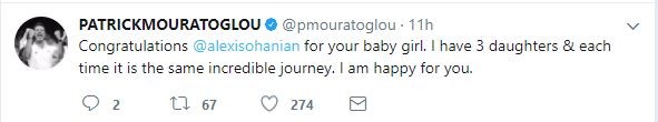 “Συγχαρητήρια Σερένα, για το κοριτσάκι σου. Είμαι πολύ χαρούμενος και συναισθάνομαι την ευτυχία σου. Παρεμπιπτόντως, ελπίζω να αναρρώσεις γρήγορα… γιατί μας περιμένει σκληρή δουλειά”, έγραψε ο προπονητής της Patrick Mouratoglou.