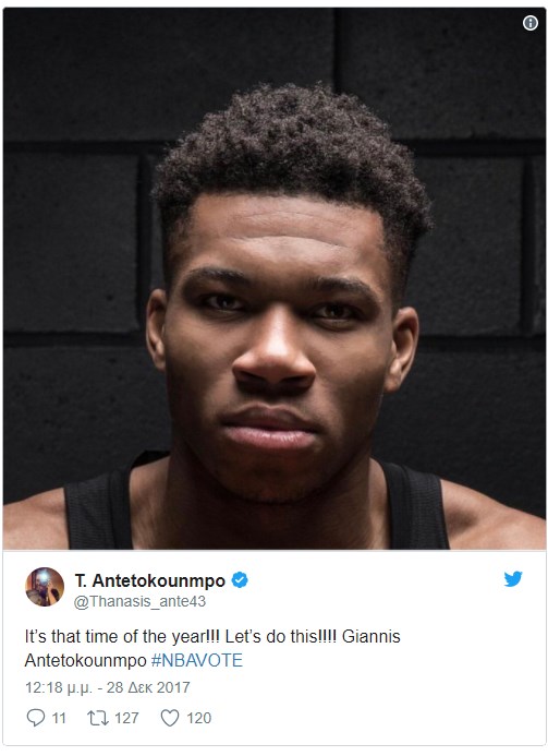 Ο Θανάσης Αντετοκούνμπο στηρίζει και φέτος τον αδερφό του Γιάννη στην ψηφοφορία για το All Star Game.