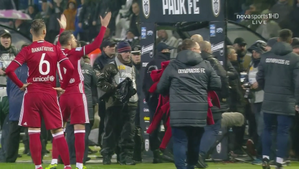 Άπαντα τα μέλη της αποστολής του Ολυμπιακού κατευθύνθηκαν αμέσως στον πάγκο, πλην των παικτών, που ακολούθησαν λίγο αργότερα.
