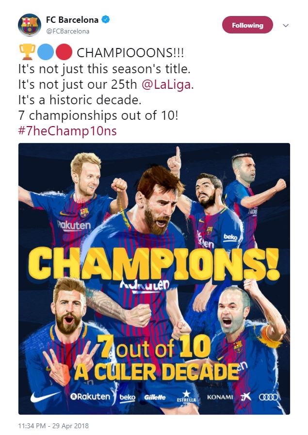 Η ομάδα του Ερνέστο Βαλβέρδε επικράτησε στη Γαλικία με 4-2 της Λα Κορούνια και σφράγισε και μαθηματικά την κατάκτηση του 25ου πρωταθλήματος της ιστορίας της και 7ου την τελευταία δεκαετία. Δείτε το tweet της Μπαρτσελόνα: