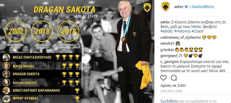Στη δεύτερη θέση των προπονητών με τους περισσότερους τίτλους στην ΑΕΚ ανέβηκε ο Ντράγκαν Σάκοτα. Το Basketball Champions League, που προστέθηκε στο φετινό Κύπελλο, αλλά και το πρωτάθλημα του 2002 ανέβασαν τον πολύπειρο προπονητή στα τρία τρόπαια ισοφαρίζοντας τους Νίκο Μήλα και Ντούσαν Ίβκοβιτς. Πρώτος είναι ο Μίσας Πανταζόπουλος που κατέκτησε τέσσερα πρωταθλήματα σερί, από το 1963 μέχρι το 1966.
