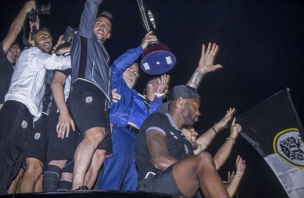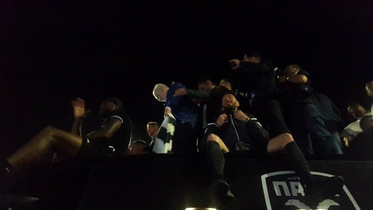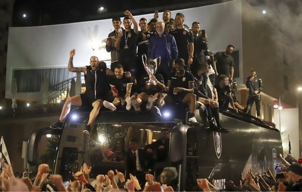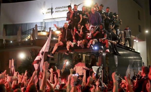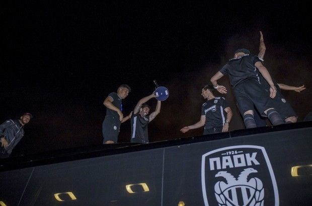 Σε ξέφρενους πανηγυρισμούς οι ποδοσφαιριστές του ΠΑΟΚ μαζί με τον Ιβάν Σαββίδη έδειχναν να απολαμβάνουν την «καυτή» ατμόσφαιρα φωνάζοντας συνθήματα πάνω από την οροφή του πούλμαν της ομάδας.