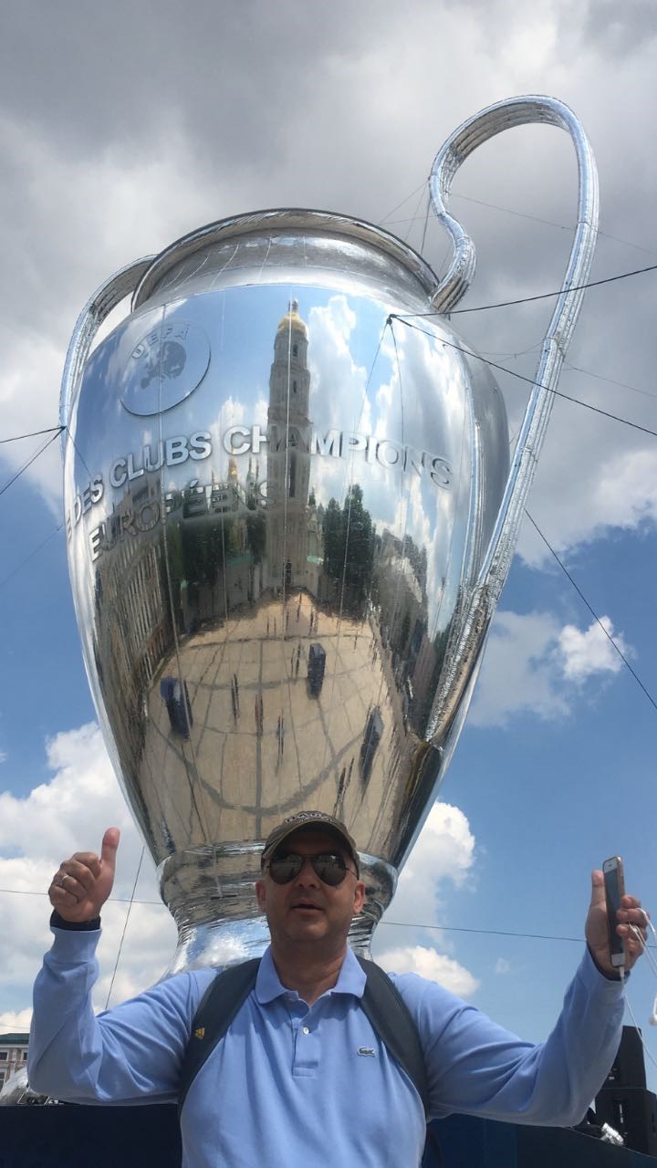 Ο απεσταλμένος του enikos.gr κάτω από το ομοίωμα του βαρύτιμου τροπαίου του Τσάμπιονς Λιγκ,σε κεντρική πλατεία του Κιέβου.