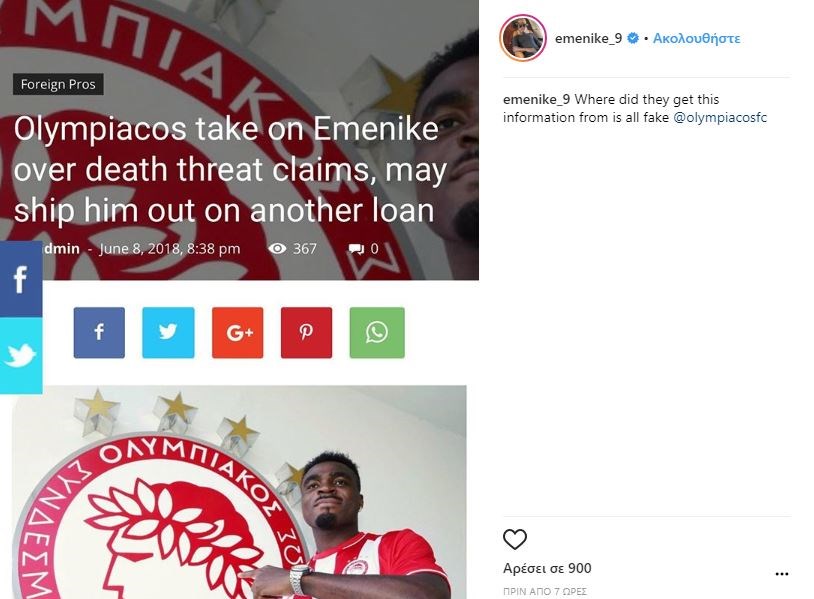 Καμία υπόσταση δεν έχει δημοσίευμα από τη Νιγηρία που έκανε λόγο για κόντρα οπαδών του Ολυμπιακού με τον πρώην ποδοσφαιριστή της ομάδας Εμάνουελ Εμενίκε, όπως ξεκαθάρισε ο ίδιος μέσω Instagram.