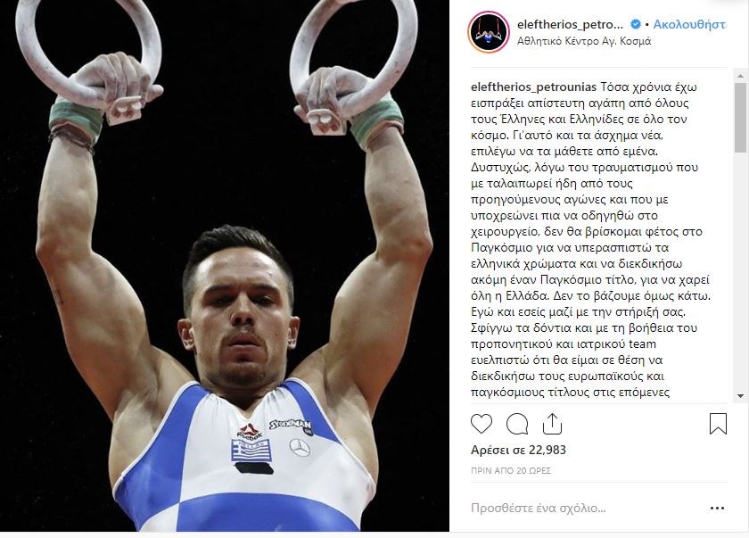 Σ’ αυτή τη δύσκολη στιγμή για τον κορυφαίο αθλητή στο αγώνισμα των κρίκων επέλεξε ο ίδιος να δημοσιοποιήσει τα άσχημα μαντάτα. Ο Λευτέρης μπαίνει στο χειρουργείο και δεν θα συμμετάσχει στο Παγκόσμιο πρωτάθλημα, ώστε να διεκδικήσει έναν τίτλο. Θα παλέψει, όμως σ’ αυτή τη δυσκολία και σίγουρα, θα βγει νικητής, δηλαδή, θα είναι έτοιμος για να διεκδικήσει τους ευρωπαϊκούς και παγκόσμιους τίτλους. Να τι έγραψε ο Λευτέρης Πετρούνιας στους διαδικτυακούς φίλους του: