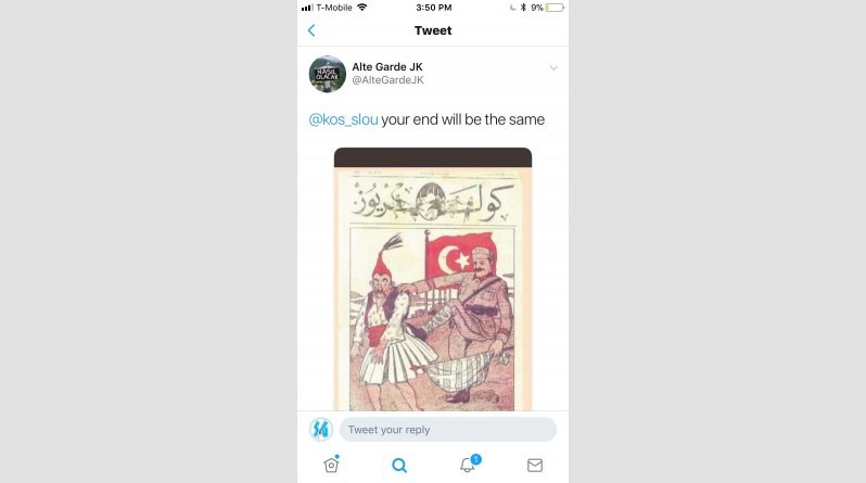 Εμετικά σχόλια στα social media με αναφορές και στη Μικρασιατική Καταστροφήκάνουν τις τελευταίες ώρες οι Τούρκοι μετά την άρνηση του Κώστα Σλούκα να μεταφέρει το πανό για τον Κεμάλ Ατατούρκ με το οποίο εισήλθαν οι παίκτες της Φενέρμπαχτσε στην Ulker Sports Arena για τα 81 χρόνια από τον θάνατο του.Να θυμίσουμε πως λίγες ώρες νωρίτερα, ο Τούρκος σέντερ Σεμίχ Ερντέν σχολίασε μέσω του λογαριασμού του στο twitter το περιστατικό με τον Κώστα Σλούκα.Ο Ερντέν έγραψε στο twitter: «Σλούκα, δεν θα τρως ψωμί σε αυτή τη χώρα χωρίς να σέβεσαι τον ιδρυτή μας. Θα δείχνεις σεβασμό στον πρόγονο μας, τον οποίο σέβονται σε όλο τον κόσμο».Δείτε ορισμένα από αυτά: