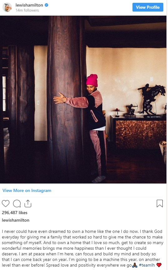«Είμαι σε ηρεμία όταν βρίσκομαι εδώ και μπορώ να συγκεντρωθώ και να “χτίσω” μυαλό και σώμα, προκειμένου να επιστρέψω δριμύτερος. Φέτος θα είμαι μία μηχανή, στο υψηλότερο επίπεδο από ποτέ», έγραψε στον προσωπικό του λογαριασμό στο instagram o πιλότος της Mercedes, συνοδεύοντας τις… επιθυμίες του με μία φωτογραφία του, στην οποία αγκαλιάζει έναν κορμό και χαμογελάει σε ηρεμία, στο σπίτι του, το οποίο είναι ένα όνειρο που έγινε πραγματικότητα όπως λέει χαρακτηριστικά.