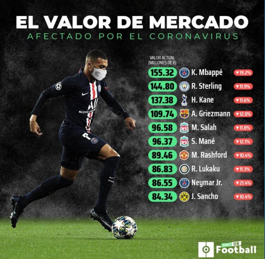 Ο πρωτοπόρος Κιλιάν Εμπαπέ σημείωσε πτώση 19,2%. Ο 2ος στην δεκάδα Ραχίμ Στέρλινγκ 11,9%. Ο Χάρι Κέιν κατέγραψε μείωση 11,6% και συνιστούν την τριάδα που έμεινε αμετακίνητη στο βάθρο πριν και μετά την πανδημία. Ωστόσο, υπήρξαν σημαντικές ανακατατάξεις, με τον Σαλάχ να είναι ο μόνος που ανέβηκε δύο θέσεις, τον Τζέιντον Σάντσο να «κλέβει» τη θέση του Ρόμπερτ Φιρμίνο στη δεκάδα και τον Νεϊμάρ να υποχωρεί μεν ένα νούμερο, χάνοντας πάνω από το 1/5 της μέχρι πρότινος αξίας του. Την ίδια ώρα, ο Πάολο Ντιμπάλα, ο πιο διακεκριμένος παίκτης που έδειξε θετικός στον κορονοϊό, σημείωσε εμφανή πτώση του 12%, αν και έτσι κι αλλιώς δεν κατείχε θέση στα πρώτα 10 ονόματα.