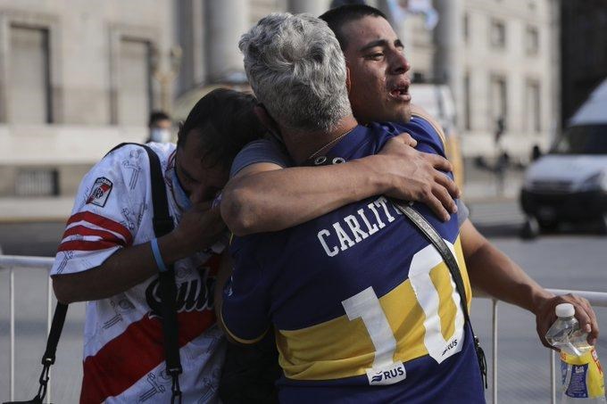 Εκεί βρίσκονται οπαδοί των Μπόκα Τζούνιορς και Ρίβερ Πλέιτ, φορούν τις φανέλες των ομάδων τους και αγκαλιασμένοι ξεσπούν σε δάκρυα για τον θρύλο του παγκόσμιου ποδοσφαίρου.