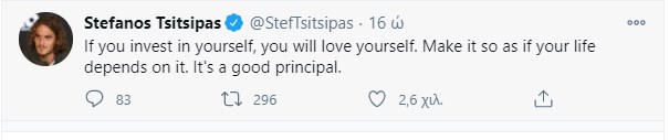 «Αν επενδύσεις στον εαυτό σου, θα τον αγαπήσεις. Κάντο σαν η ζωή σου να εξαρτάται από αυτό. Είναι μια καλή αρχή» έγραψε χαρακτηριστικά ο Τσιτσιπάς.