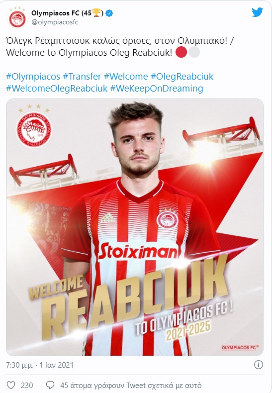 Παίκτης του Ολυμπιακού είναι και επίσημα πλέον ο Όλεγκ Ρέαμπτσιουκ. Ο Μολδαβός αριστερός μπακ ήρθε τα ξημερώματα στην Ελλάδα, πέρασε από όλες τις απαραίτητες ιατρικές εξετάσεις, υπέγραψε το νέο του συμβόλαιο με τους Πειραιώτες και πριν από λίγο ανακοινώθηκε και επίσημα. Αξίζει να σημειώσουμε ότι το συμβόλαιο που υπέγραψε ο Ολεγκ Ρέαμπτσιουκ είναι μέχρι το καλοκαίρι του 2025.