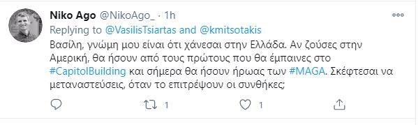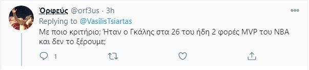 Σε ανάρτησή του στο Twitter δε, αναφέρει μεταξύ άλλων ότι στη θέση του Αντετοκούνμπο θα έπρεπε να είναι ο Νίκος Γκάλης. Οι αναρτήσεις αυτές προκάλεσαν την έντονη αντίδραση χρηστών του Twitter. Κάποιοι του απαντούν με ειρωνικά σχόλια του τύπου “μήπως θα ήθελες να είσαι εσύ στη θέση του;” ή λέγοντάς του “Βασίλη, χάνεσαι στην Ελλάδα. Αν ζούσες στην Αμερική θα ήσουν από τους πρώτους που θα έμπαινες στο Καπιτώλιο” και άλλοι του δίνουν απαντήσεις σχετικά με τον Νίκο Γκάλη γράφοντας χαρακτηριστικά: “με ποιο κριτήριο; Ήταν ο Γκάλης στα 26 του δύο φορές MVP του NBA και δεν το ξέρουμε;”.