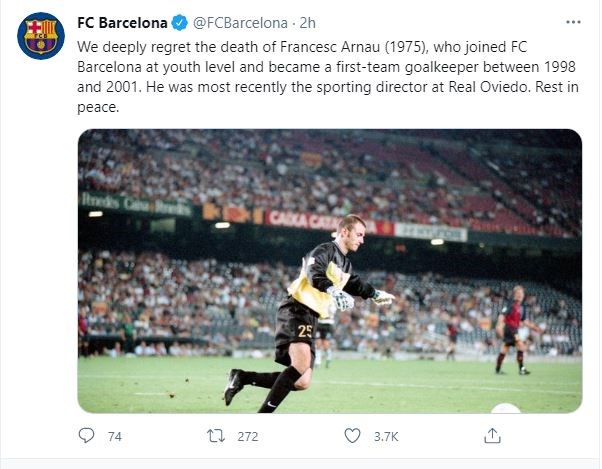 “Λυπούμαστε πολύ για τον θάνατο του Αρνάου Φράντσεσκ (1975), ο οποίος προσχώρησε στην FC Barcelona σε επίπεδο νεολαίας και έγινε τερματοφύλακας πρώτης ομάδας μεταξύ 1998 και 2001. Μέχρι πρότινος ήταν ο αθλητικός διευθυντής του Real Oviedo. Αναπαύσου εν ειρήνη”, αναφέρεται σε ανάρτηση που έκανε η ομάδα στο Twitter.