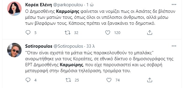 Ο αθλητικός δημοσιογράφος της ΕΡΤ, Δημοσθένης Καρμοίρης, βρέθηκε ξανά στο επίκεντρο μέσα σε λίγες ώρες λόγω ενός σχολίου που έκανε για τους Κορεάτες.