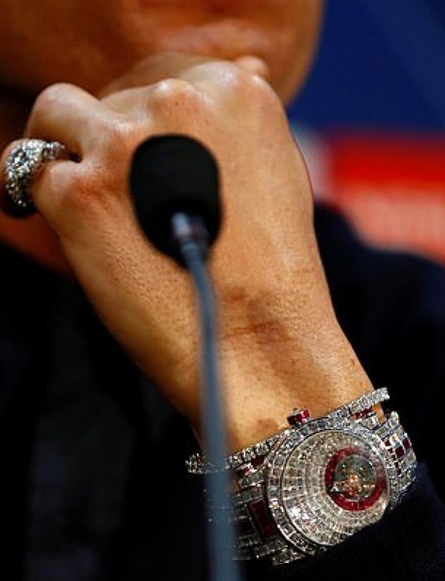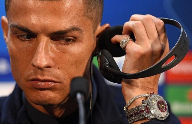 Κι όμως! Είναι αλήθεια! Το ρολόι που φοράει ο Κριστιάνο Ρονάλντο κοστίζει 2 εκατομμύρια ευρώ. Και είναι διακοσμημένο με 424 διαμάντια. Ο Κριστιάνο είναι ένας από τους δύο πιο ακριβοπληρωμένους άσσους του ποδοσφαίρου (μαζί με τον Λιονέλ Μέσι), οπότε τα χρήματα ποτέ δεν ήταν πρόβλημα για αυτόν.Στη χθεσινή συνέντευξη Τύπου στο Μάντσεστερ, ενόψει της αναμέτρησης αναμέτρησης της Μάντσεστερ Γιουνάιτεντ με την Γιουβέντους για το Champions League, ο Πορτογάλος σούπερ σταρ φορούσε το συγκεκριμένο ρολόι μάρκας «Jacob&Co», σειράς Caviar Tourbilion! Θαυμάστε το ρολόι στο βίντεο που ακολουθεί, από το 6.10 και μετά: