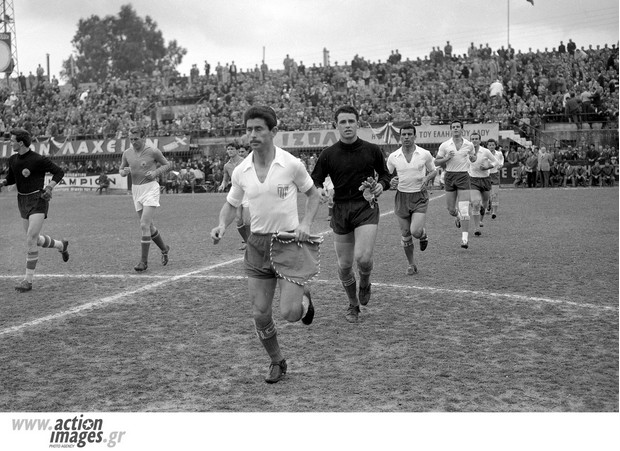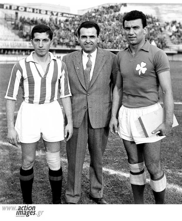 Στη φωτογραφία ο Κώστας Λινοξυλάκης με τον Θανάση Μπέμπη πριν από ντέρμπι Παναθηναϊκού-Ολυμπιακού στις 20/11/1958