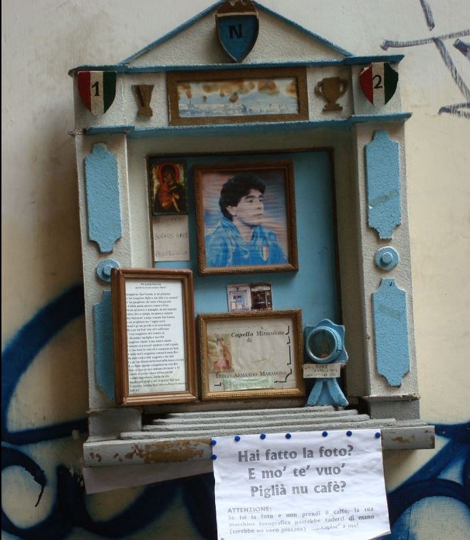 Τόσο στην Αργεντινή όσο και στη Νάπολη, ο Μαραντόνα έγινε σύμβολο, αθλητικός ήρωας, «θεός». Μεγάλωσε στις παραγκουπόλεις του Μπουένος Άιρες, όπου ο όρος viveza criolla- «εγγενής πονηριά» και η ικανότητα να ξεγελάσει αυτούς που είχαν την εξουσία θεωρείται ως θετικό ποιοτικό στοιχείο. 20.000 άτομα έγραψαν το Viva Maradona στις ψήφους τους στα τέλη της δεκαετίας του 1980, μια τρίχα από το κεφάλι του φυλάσσεται με ασφάλεια σε τοπικό ιερό. Η παρουσία του στο σύνολό της (με όλα τα πλεονεκτήματα και τις ιδιαιτερότητες- ακόμα και τις οφθαλμοφανώς αρνητικές) και όχι μόνο τα αθλητικά επιτεύγματα ήταν τέτοια που οδήγησε σε εκδηλώσεις λατρείας.[286] Στην υποτιθέμενη δημοκρατική βάση του αθλητισμού, ο ήρωας αντιπροσωπεύει όχι μόνο το επιθυμητό επίτευγμα, αλλά και τον κοινό χαρακτήρα των ευκαιριών. Ο Μαραντόνα φαίνεται να άγγιξε τις ψυχές των ανθρώπων απλά γι’ αυτό που είναι και πρέπει επίσης να προστεθεί ο μύθος της αντιπαράθεσης του με τους «ισχυρούς», ηγέτες των ομοσπονδιών και ομάδων της βόρειας Ιταλίας, ως εκπρόσωπος των «καταπιεσμένων», των φτωχών της νότιας χώρας. Ήταν η φιγούρα του ήρωα που οδηγεί με αμίμητες δράσεις τους αδύναμους σε εντυπωσιακές νίκες απέναντι στους ισχυρούς. Όπως έγραψε ο Oυρουγουανός συγγραφέας Εντουάρντο Γκαλεάνο «Ο Ντιέγο Μαραντόνα δεν λατρεύτηκε μόνο για τα μοναδικά ζογκλερικά του, αλλά επειδή ήταν ένας θεός βρώμικος, αμαρτωλός. Ο πιο ανθρώπινος από τους θεούς».