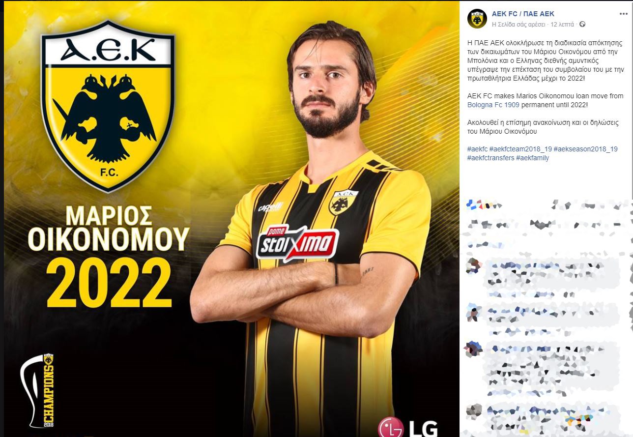 Παίκτης της ΑΕΚ έως το 2022 θα είναι ο Μάριος Οικονόμου.Όπως ενημέρωσε η «κιτρινόμαυρη» ΠΑΕ, ολοκληρώθηκε η διαδικασίας απόκτησής των δικαιωμάτων του παίκτη από την Μπολόνια και έτσι ο διεθνής αμυντικός υπέγραψε την επέκταση του συμβολαίου του με την πρωταθλήτρια Ελλάδας μέχρι το 2022.Δείτε την ανάρτηση στο Facebook: