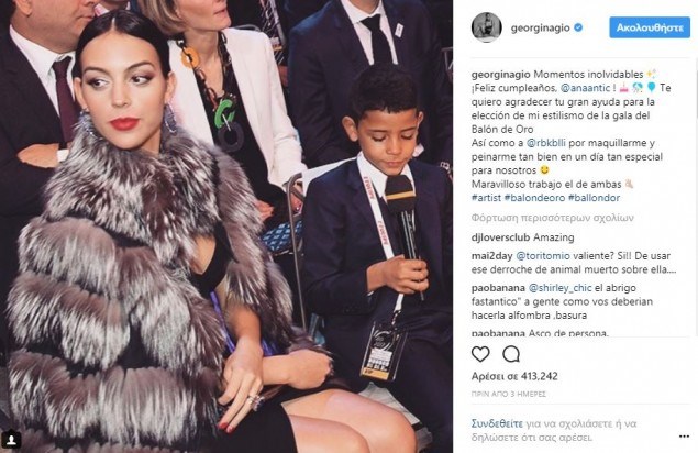 Για την περίσταση, η Ισπανίδα, μητέρα του τέταρτου παιδιού του Ρονάλντο, επέλεξε να φορέσει μια μαύρη τουαλέτα και από πάνω μια γούνα, καθώς η εκδήλωση έγινε σε ανοιχτό χώρο και το κρύο ήταν αισθητό.