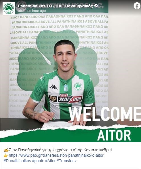 «Η ΠΑΕ Παναθηναϊκός ανακοινώνει την απόκτηση του Ισπανού μεσοεπιθετικού Αϊτόρ Κανταλαπιέδρα. Το συμβόλαιο συνεργασίας με τον 24χρονο ποδοσφαιριστή έχει τριετή διάρκεια.