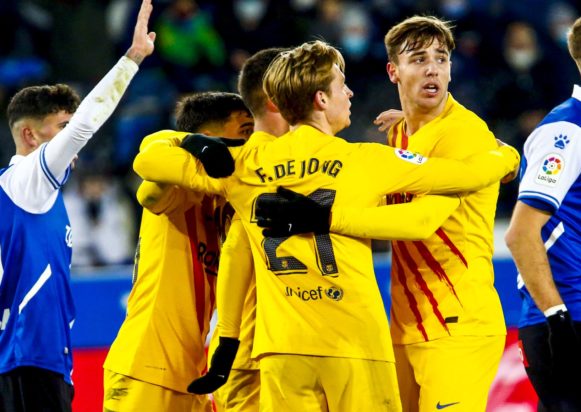 Η ομάδα του Τσάβι πήρε υπερπολύτιμη νίκη επί της Αλαβές στο «Μεντιθορόθα» (έβδομο «διπλό» στις τελευταίες 8 επισκέψεις της) με το γκολ του Φρένκι ντε Γιονγκ στο 87΄ (1-0) και μείωσε σε απόσταση αναπνοής από την 4η Ατλέτικο Μαδρίτης.