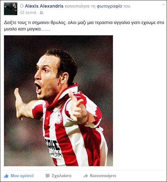 «Δείξτε τους τι σημαίνει θρύλος..Όλοι μαζί μια τεράστια αγκαλιά γιατί έχουμε στο μυαλό κάτι μαγικό…….», ήταν το σχόλιο του παλαίμαχου άσου του Ολυμπιακού.