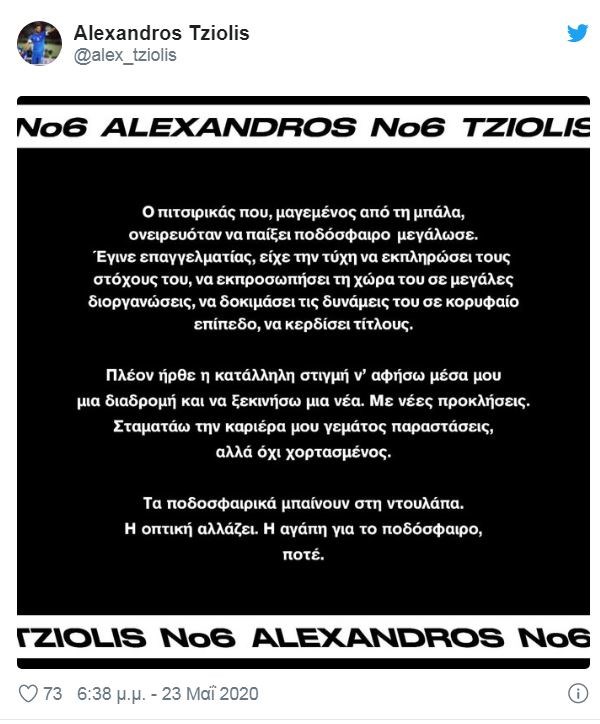 Ο Αλέξανδρος Τζιόλης ανακοίνωσε πως βάζει… τελεία στην καριέρα του το Σάββατο (23/5). Ο διεθνής αμυντικός μέσος ανακοίνωσε από τους προσωπικούς λογαριασμούς του στα Social Media πως αποφάσισε να «κρεμάσει τα παπούτσια του», σε ηλικία 35 ετών.