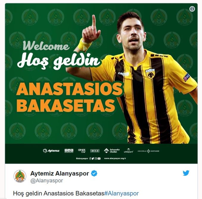 Η ΑΕΚ έκανε γνωστή την παραχώρηση του Τάσου Μπακασέτα στην Αλάνιασπορ και στην ανακοίνωσή της ευχαριστεί τον διεθνή άσο για την προσφορά του στην ομάδα και του εύχεται καλή συνέχεια στην καριέρα του.