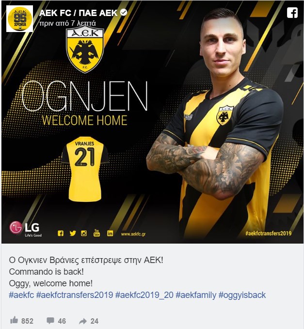 Φυσικά, η επιλογή μόνο τυχαία δεν είναι για τον Βράνιες που έχει λατρεία για τους ΑΕΚτζήδες και εκείνοι γι’ αυτόν.Πηγή: Filathlos.gr