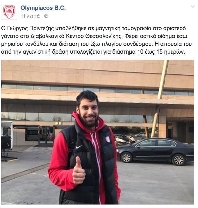 «Ο Γιώργος Πρίντεζης υποβλήθηκε σε μαγνητική τομογραφία στο αριστερό γόνατο στο Διαβαλκανικό Κέντρο Θεσσαλονίκης. Φέρει οστικό οίδημα έσω μηριαίου κονδύλου και διάταση του έξω πλαγίου συνδέσμου. Η απουσία του από την αγωνιστική δράση υπολογίζεται για διάστημα 10 έως 15 ημερών».