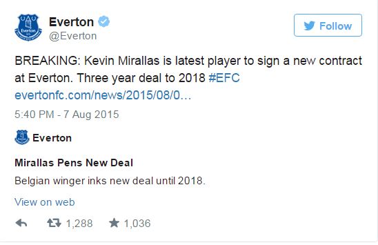 Με τη φανέλα της Έβερτον θα συνεχίσει να αγωνίζεται και τα επόμενα χρόνια ο Κέβιν Μιραλάς, καθώς ο αγγλικός σύλλογος ανακοίνωσε την επέκταση του συμβολαίου του Βέλγου μεσοεπιθετικού για τρία χρόνια.