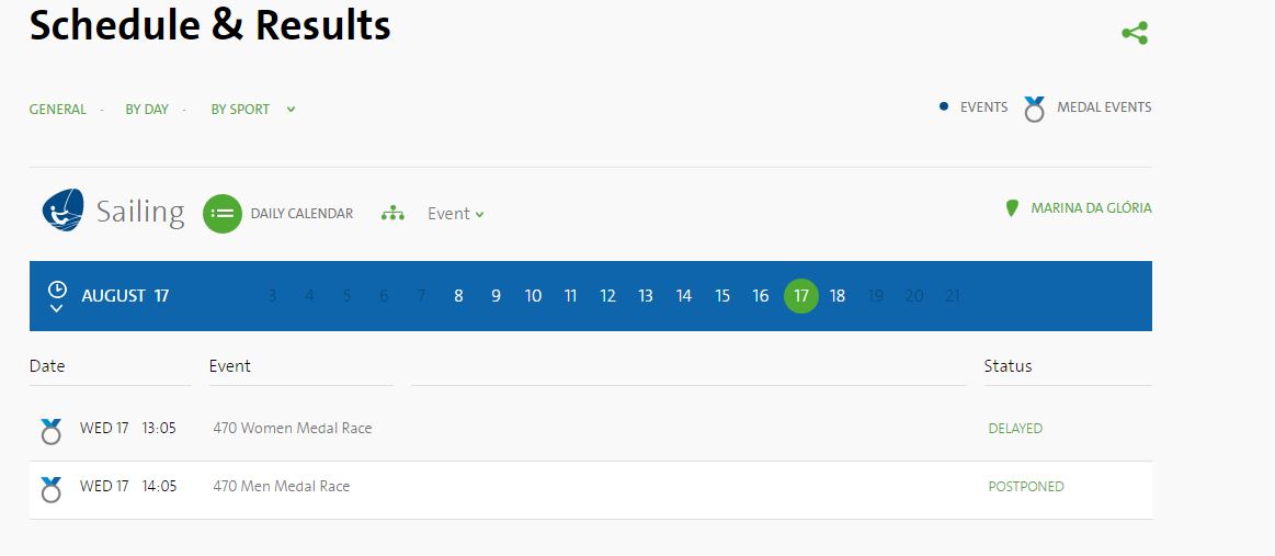 Η προγραμματισμένη για σήμερα medal race αναβλήθηκε λόγω αέρα. Υπήρξε άπνοια με αποτέλεσμα οι διοργανωτές να πρέπει τώρα να χωρέσουν τουλάχιστον τρεις κούρσες μεταλλίων στο πρόγραμμα της Πέμπτης.
