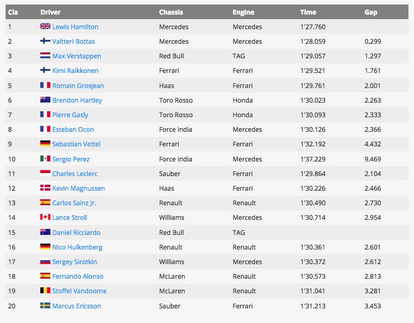 Ο Βρετανός δεν δυσκολεύτηκε να κάνει τους ταχύτερους γύρους, με τον έτερο πιλότο της Mercedes, Μπότας, να κατακτά τη δεύτερη θέση και τον Φερστάπεν να παίρνει την τρίτη. Από την ένατη θέση θα ξεκινήσει ο Σεμπάστιαν Φέτελ.