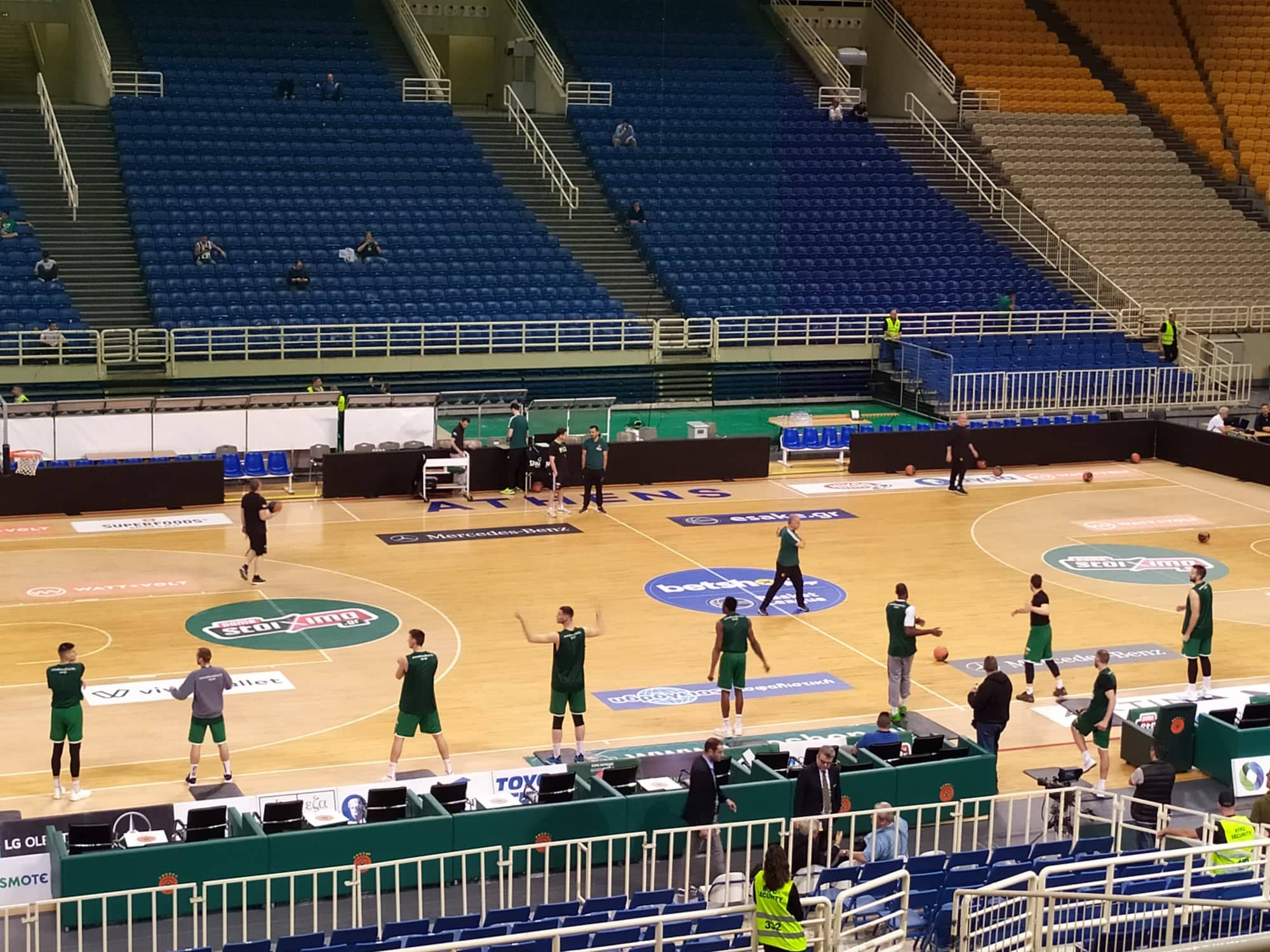 Οι παίκτες του Ρικ Πιτίνο ολοκλήρωσαν το ζέσταμά τους και πλέον συμμετέχουν σε οικογενειακό διπλό στο ΟΑΚΑ.