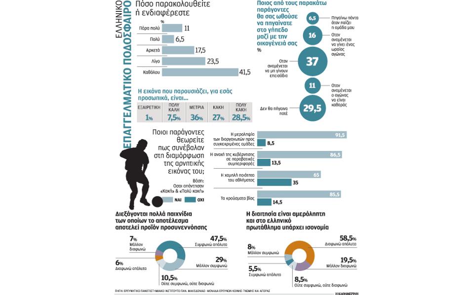 Στο ερώτημα «πόσο παρακολουθείτε ή ενδιαφέρεστε για το ελληνικό επαγγελματικό ποδόσφαιρο» το 41,5% απάντησε «καθόλου», 23,5% απάντησε «λίγο», το 17,5 «αρκετά», το 6,5 «πολύ» και το 11% «πάρα πολύ».