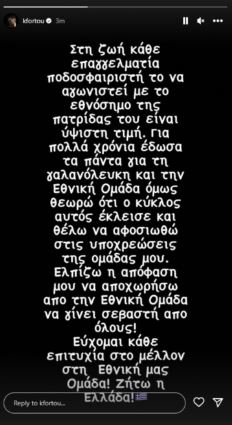 «Ο κύκλος αυτός έκλεισε» τονίζει ο Κώστας Φορτούνης στο Instagram, εκφράζοντας την ελπίδα να γίνει σεβαστή απ’ όλους η απόφασή του να αποχωρήσει, ενώ ευχήθηκε καλή επιτυχία στην ομάδα.
