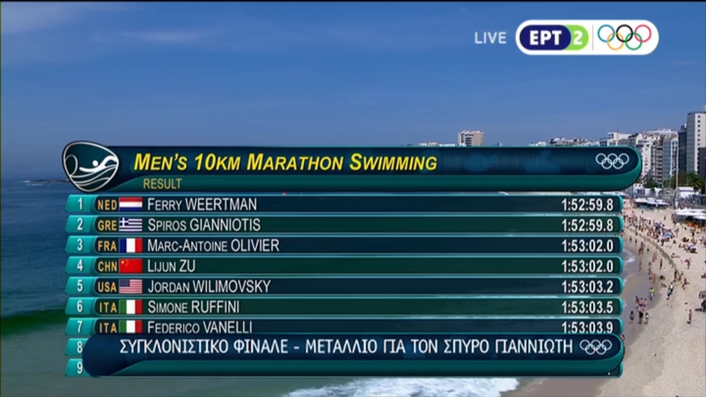 Το αργυρό μετάλλιο πήρε τελικά ο Σπύρος Γιαννιώτης στα 10χλμ. κολύμβησης σε ανοιχτή θάλασσα στους Ολυμπιακούς του Ρίο, ύστερα από ένα συγκλονιστικό φινάλε.