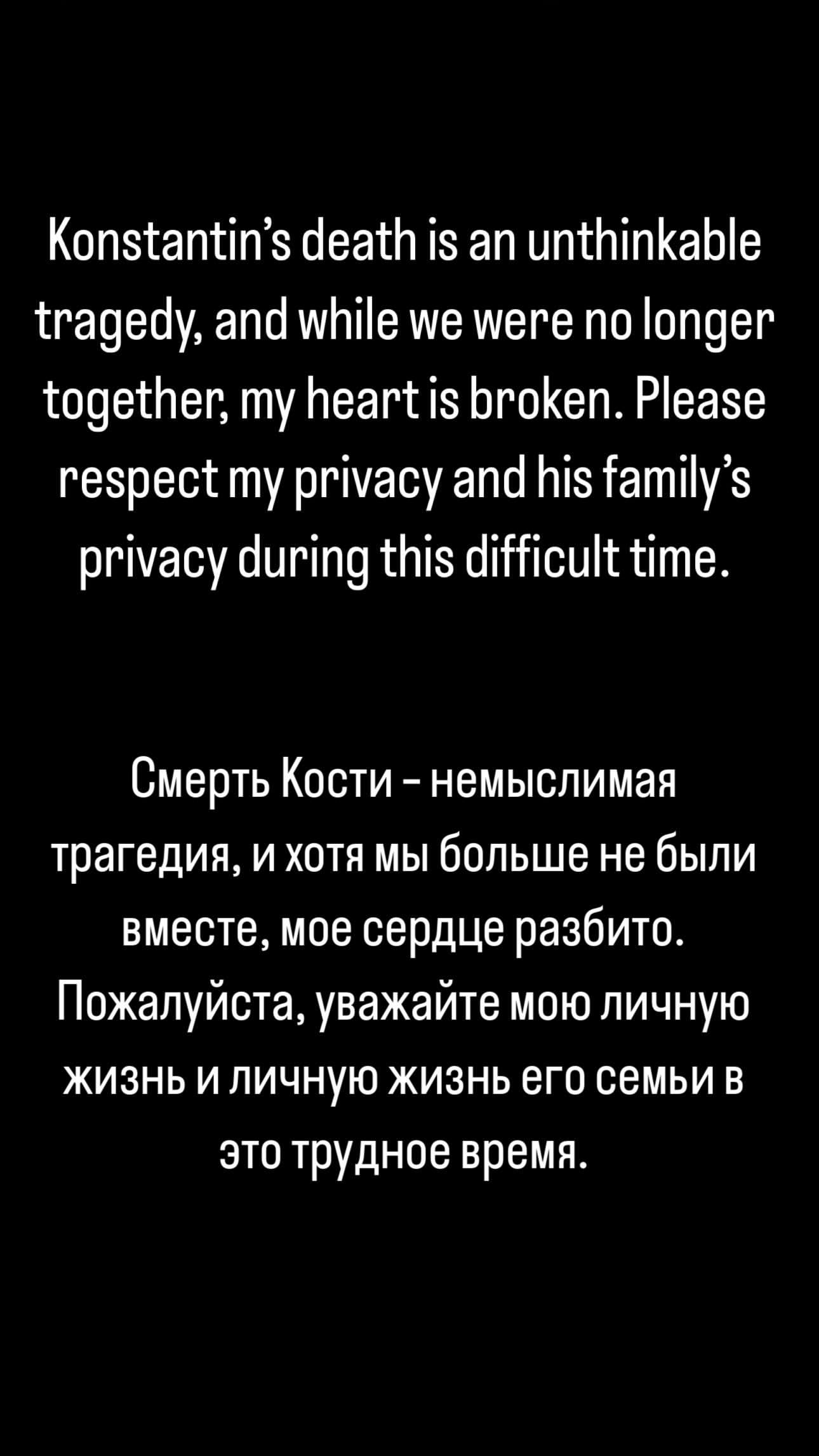 Μέσα από μία ανάρτηση που έκανε στο Instagram προφίλ της, η Αρίνα Σαμπαλένκα δήλωσε: «Ο θάνατος του Κονσταντίν είναι μια αδιανόητη τραγωδία και μολονότι δεν ήμασταν πια μαζί, είμαι συντετριμμένη. Παρακαλώ σεβαστείτε την ιδιωτικότητά μου και την ιδιωτικότητα της οικογένειάς του, αυτή την δύσκολη στιγμή».