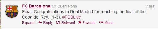 Το μήνυμα γράφει: «Τελικό. Συγχαρητήρια στη Ρεάλ Μαδρίτης για τη συμμετοχή της στον τελικό του Copa Del Rey. (1-3).