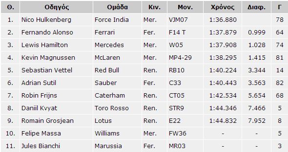 Στο τέλος της ημέρας, στην πρώτη θέση του πίνακα των χρόνων βρισκόταν το όνομα του Nico Hulkenberg. Ο Γερμανός οδηγός της Force India σημείωσε το καλύτερο πέρασμα το απόγευμα, όπως έκαναν και οι περισσότεροι από τους άλλους οδηγούς, και έφερε τη Force India-Mercedes στην κορυφή. Μάλιστα, η διαφορά του Hulkenberg από τον δεύτερο ήταν 1 δευτερόλεπτο, αν και όπως έχει τονιστεί πολλές φορές οι χρόνοι σε αυτό το σημείο της προετοιμασίας των ομάδων δεν έχουν μεγάλη σημασία.