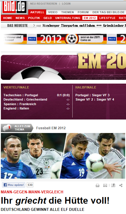 Να και οι συγκρίσεις που κάνει η Bild : «Τερματοφύλακας: Νόιερ vs Σηφάκης: Ο κορυφαίος τερματοφύλακας στον κόσμο αποτελεί εγγύηση για το μηδέν στα μετόπισθεν. Οι Έλληνες δεν θα του βάλουν γκολ με τίποτα. Ο Σηφάκης βοήθησε την Ελλάδα να κρατήσει τη νίκη με 1-0 απέναντι στη Ρωσία. Όμως δεν έχει τύχη απέναντι στον Νόιερ». «Δεξί μπακ: Μπόατενγκ vs Τοροσίδης: Ο Μπόατενγκ με την επιστροφή του στην ενδεκάδα καίγεται για τη νίκη. Ο Τοροσίδης είναι ένας από τους πιο έμπειρους παίκτες της Ελλάδας, αλλά ο Μπόατενγκ τον έχει στο τσεπάκι». «Στόπερ: Χούμελς vs Παπασταθόπουλος: Ο Χούμελς είναι από τους μεγάλους νικητές της διοργάνωσης. Κρατάει το μηδέν πίσω. Ο σταρ της Βέρντερ αποβλήθηκε άδικα στο πρώτο ματς. Η μάχη γέρνει στην πλευρά του Χούμελς». «Στόπερ: Μπαντστούμπερ vs Παπαδόπουλος: Ο Μπαντστούμπερ είναι καλύτερος αγωνιστικά αλλά και στις θέσεις που παίρνει. Ο Παπαδόπουλος παρασύρεται συχνά. Ο Μπαντστούμπερ είναι πιο ψύχραιμος». «Αριστερό μπακ: Λαμ vs Τζαβέλλας: Ο Λαμ δεν έχει κάνει λάθη στο τουρνουά. Για παράδειγμα περιόρισε από την πλευρά του τον Ρόμπεν. Ο Τζαβέλλας είναι ο τελευταίος Έλληνας που σκόραρε κατά του Νόιερ, με μία απίθανη λόμπα. Όμως αυτά δεν ξαναγίνονται». «Μέσος: Κεντίρα vs Μάκος: Ο Κεντίρα οργώνει το κέντρο με τον Σβαϊνστάιγκερ. Δεν μπορεί να περάσει κανένας από τους τεμπέληδες Έλληνες. Ο Κεντίρα θα πρέπει να τον δέσει με λάσο μαζί με τον Γκέκα». «Μέσος: Σβαϊνστάιγκερ vs Μανιάτης: Δίνει συνεχή αγώνα μετά τον τραυματισμό του. Στο ματς με τη Δανία ήταν κουρασμένος, αλλά θα είναι έτοιμος για τους Έλληνες. Ο Σβαϊνστάιγκερ θα παραλύσει τον Μανιάτη και θα βγάλει ασίστ για τους επιθετικούς μας». «Μεσοεπιθετικός: Μίλερ vs Κατσουράνης: Ο Μίλερ κινείται στα δεξιά της μεσαίας γραμμής και βοηθά ανασταλτικά. Ο Κατσουράνης έχει όνομα, αλλά ο Μίλερ είναι πιο καλός επιθετικά». «Μεσοεπιθετικός: Εζίλ vs Σαλπιγγίδης: Ο Σάντος είπε για τον Εζίλ πως είναι μεγάλο ταλέντο και δεν είναι τυχαίο ότι παίζει στη Ρεάλ Μαδρίτης. Δεν μας είπε κάτι νέο. Απέναντι σε τόσους ποιοτικούς παίκτες ο Σαλπιγγίδης δεν μπορεί να σταθεί. Λυπούμαστε». «Μεσοεπιθετικός: Ποντόλσκι vs Σαμαράς: Απέναντι στη Δανία ο Ποντόλσκι πέτυχε γκολ στην 100η του συμμετοχή. Ο Νόιερ χαρακτήρισε τον Σαμαρά ως έναν από τους πιο επικίνδυνους παίκτες της Ελλάδας. Όμως ο Ποντόλσκι έχει πλέον ζεσταθεί». «Σέντερ φορ: Γκόμεζ ή Κλόζε vs Γκέκας: Μέχρι στιγμής ο Γκόμεζ είναι πειστικός με τρία γκολ στο φετινό Euro. Όμως ο Κλόζε είναι έτοιμος και αν χρησιμοποιηθεί μπορεί με την εμπειρία του να αναστατώσει τους Έλληνες. Με την εμπειρία που έχει στην Bundesliga ο Γκέκας μπορεί να πετύχει κάτι. Όταν όμως έχει απέναντί του τον Γκόμεζ ή τον Κλόζε, έρχεται δεύτερος». Πηγή: pamesports.gr